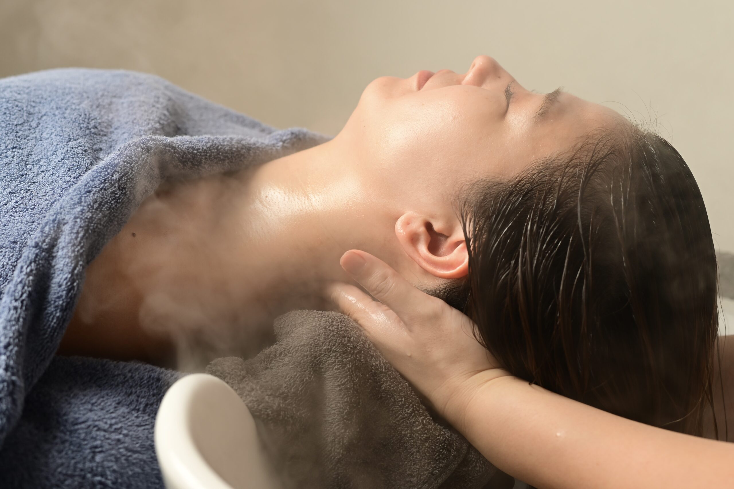 リラックス効果のあるアロマオイルを贅沢に使ったヘッドスパで、首から肩にかけての凝りを丁寧に揉みほぐします。
