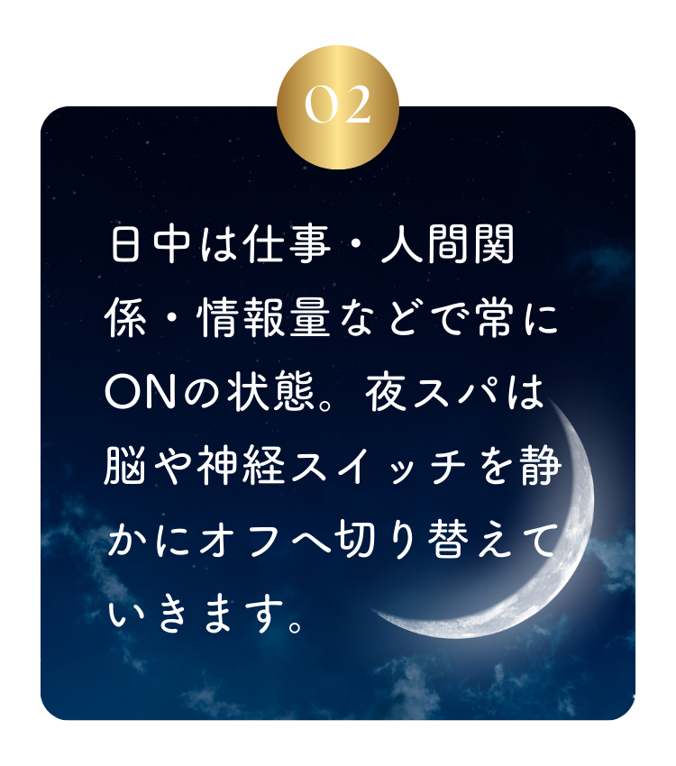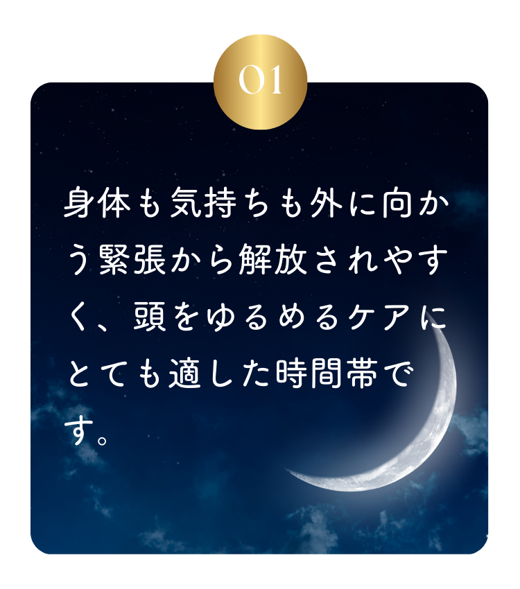静かな時間帯に、頭皮と神経をゆっくりゆるめ、深いリラックスへ導きます。