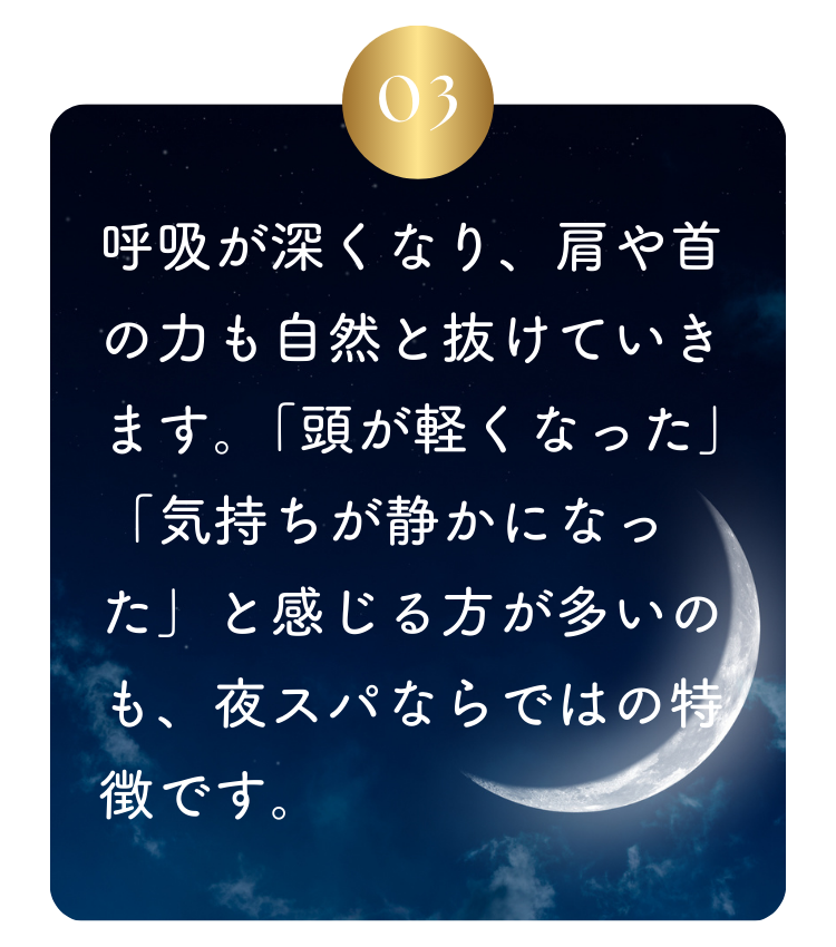 頭皮を中心に、無理のない圧でじっくりとほぐすベーシックなコース。「頭が軽くなる」「目の疲れが楽になる」と感じやすく、夜スパが初めての方にもおすすめです。
